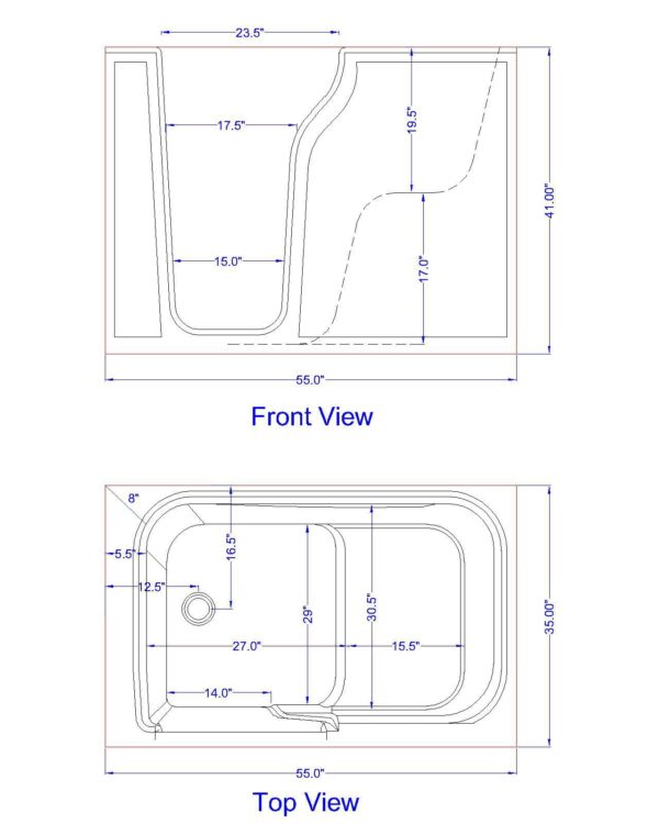 The Mobility Bathworks Tub 3355 from our ELITE Series provides a luxury spa experience from the comfort of your own home. Boasting a 41″ high tub basin, the 3355 allows for deeper upper body water immersion while maintaining a compact footprint for almost any bathtub or shower space. Its overall size and 25.5″ seat make the 3355 the perfect size for narrow, 60″ bathrooms while being large enough to accommodate individuals between 120-250 Ibs.