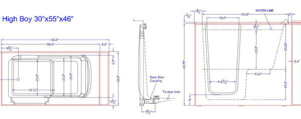 The Mobility Bathworks Tub HI BOY from our ELITE Series provides a luxury spa experience from the comfort of your own home. Boasting a 46″ high tub basin, the HI BOY allows for deeper upper body water immersion while maintaining a compact footprint for almost any bathtub or shower space. Its overall size and 24″ seat make the HI BOY the perfect size for narrow, 60″ bathrooms while being large enough to accommodate individuals between 120-250 Ibs.